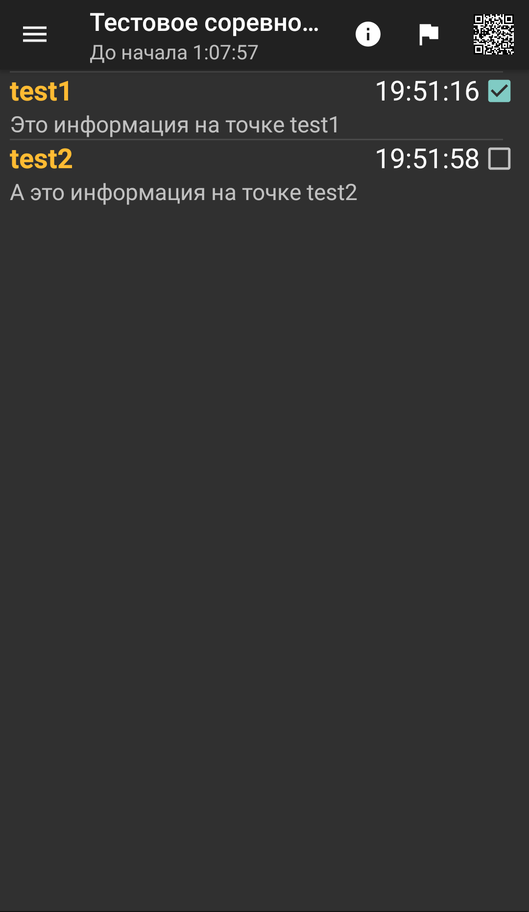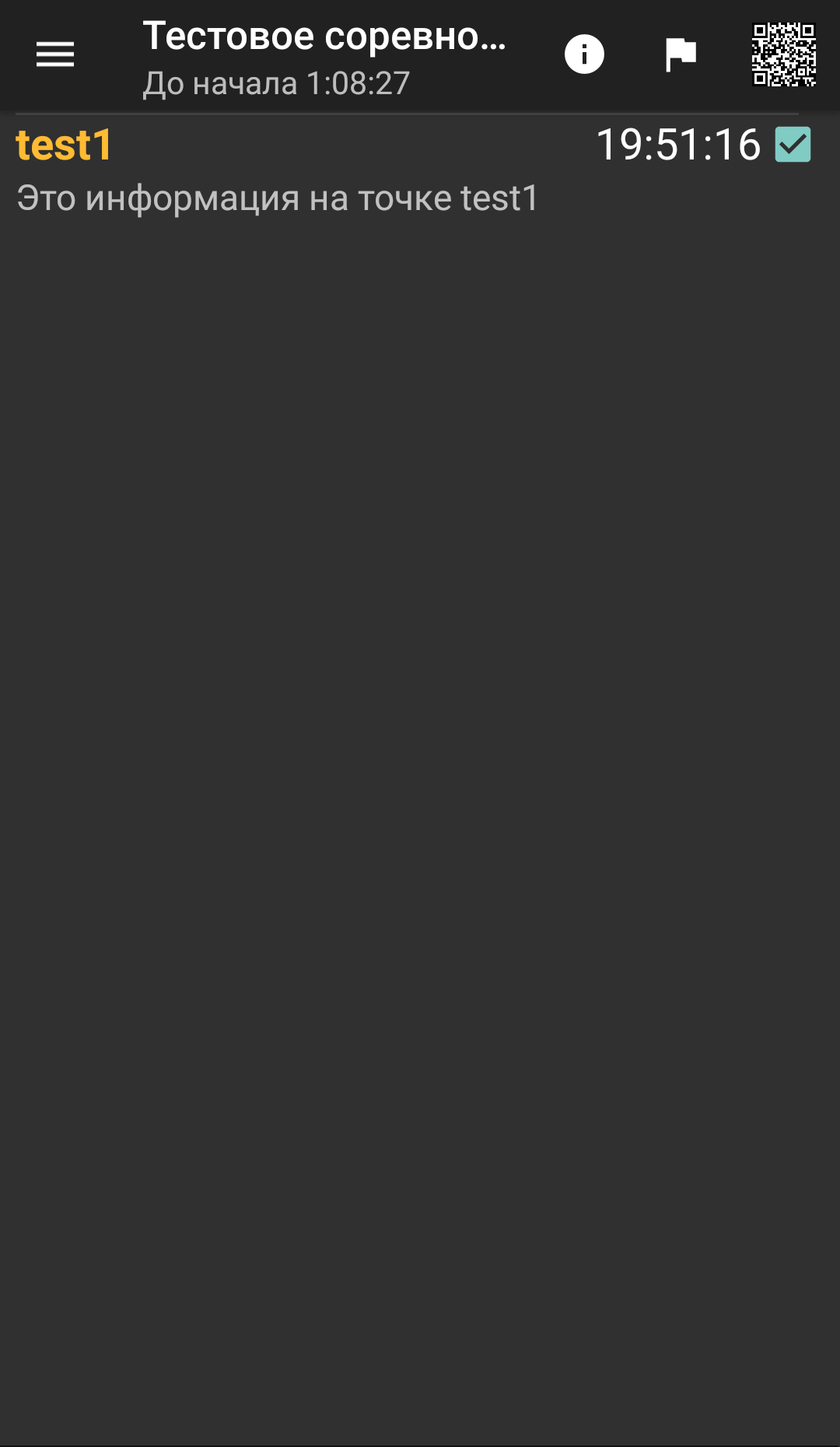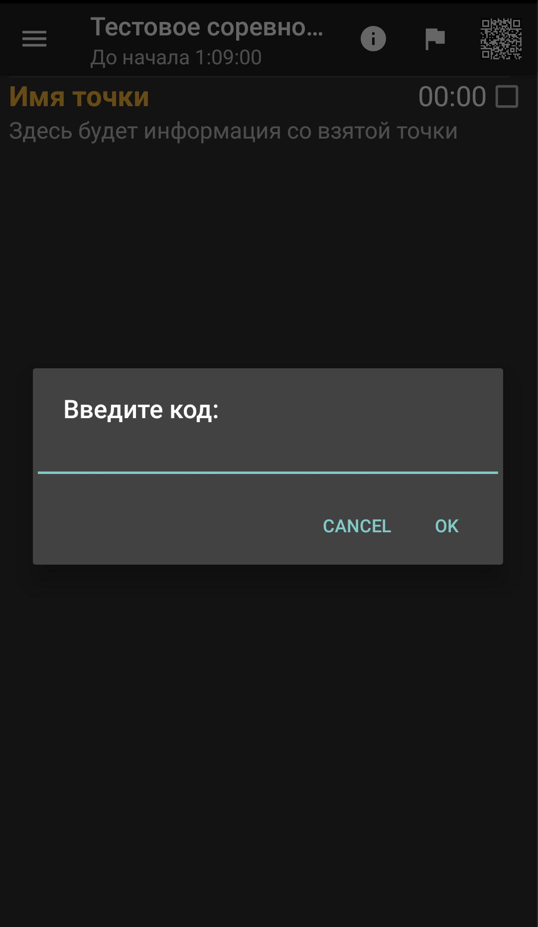 Теперь направьте камеру устройства на QR код, указанный ниже и дождитесь сигнала о том, что КП взято. QR код на экране будет обведен рамочкой, устройство должно завибрировать и на экране появится надпись "точка взята".